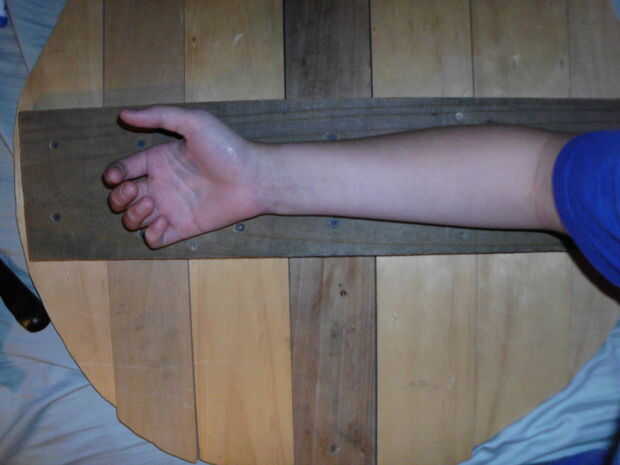 Este es un paso bastante fácil. En primer lugar, coloque su brazo en la pared posterior y marca dos lugares con un lápiz: uno en la parte más gruesa de su antebrazo y en donde pueda captar la correa, tan justo en la palma. A continuación, coloque la correa de mano y marcar apagado lo suficiente como para circundar la mano con aproximadamente 2 pulgadas de exceso por lo que la correa es ajustable. Hacer lo mismo con el antebrazo. Ahora, atornille las correas (Inserte los tornillos en los agujeros en el cinturón) para un buen ajuste. Después de un tiempo de uso, los agujeros de la correa pueden llevar en los agujeros más grandes y los tornillos se pueden escurrir. Si esto sucede, utilice una arandela para agregar extra zona a la cabeza del tornillo.