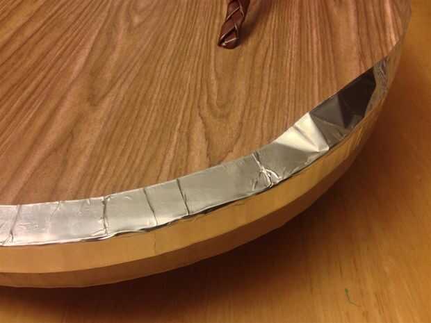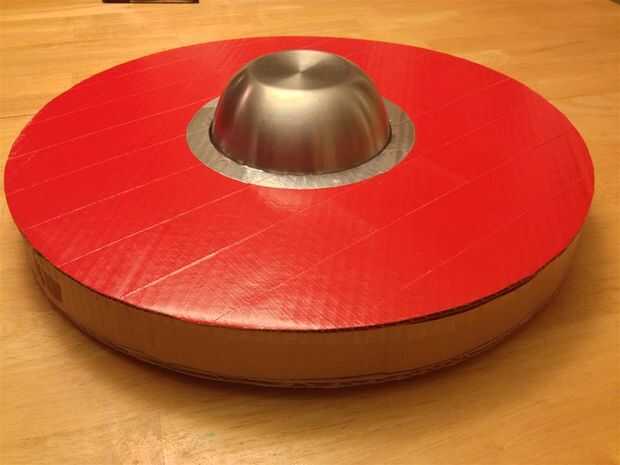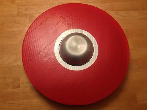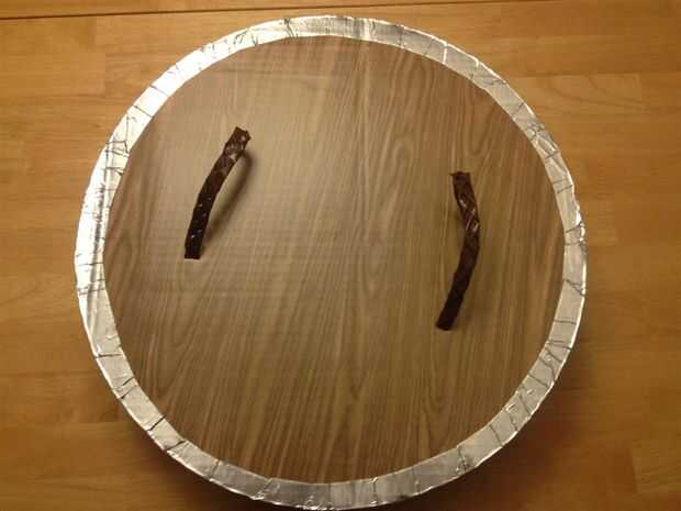 Sandwich el recipiente entre las piezas delanteras y traseros. Utilizar cinta de plata y cintas al frente y detrás junto. Salir de la cinta de superposición de los lados para que coincida con la superposición en el centro. Una sola pieza no cubren lo suficiente, por lo que envuelve el escudo otra vez, dejando a la misma más de vuelta en la pieza posterior.