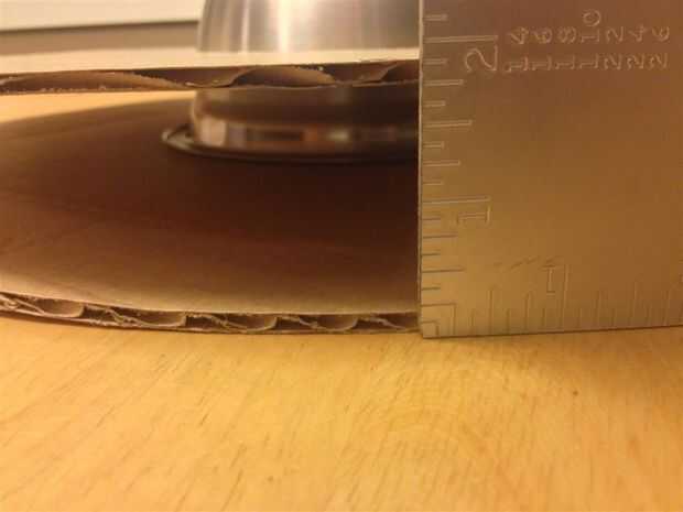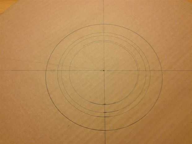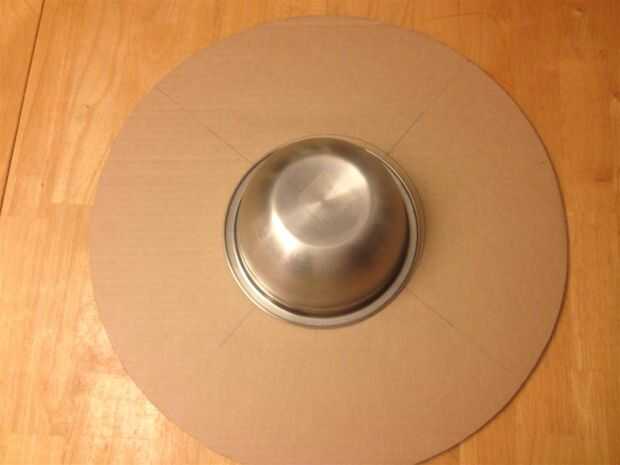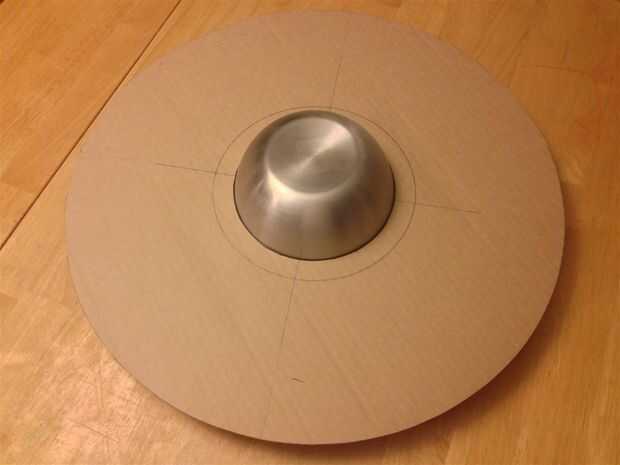 Coloque el recipiente en el centro de las ruedas de cartón y traza alrededor de él. Una rueda y otra círculos par, alrededor de una pulgada de más pequeño, dentro de la primera. Corte el círculo más pequeño desde el interior de su cartón. Se trata de la parte delantera de tu escudo. Coloque la cartulina sobre el tazón de fuente y verifique el ajuste. El frente debe quedar de 1"- 1 1/2" por encima de la parte posterior de tu escudo.