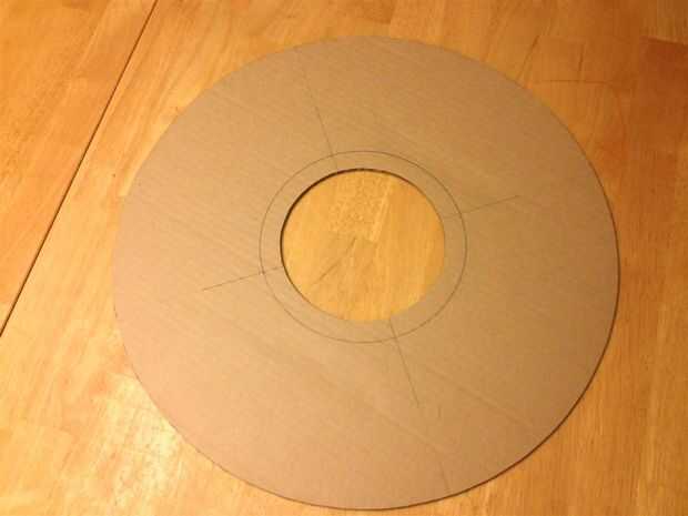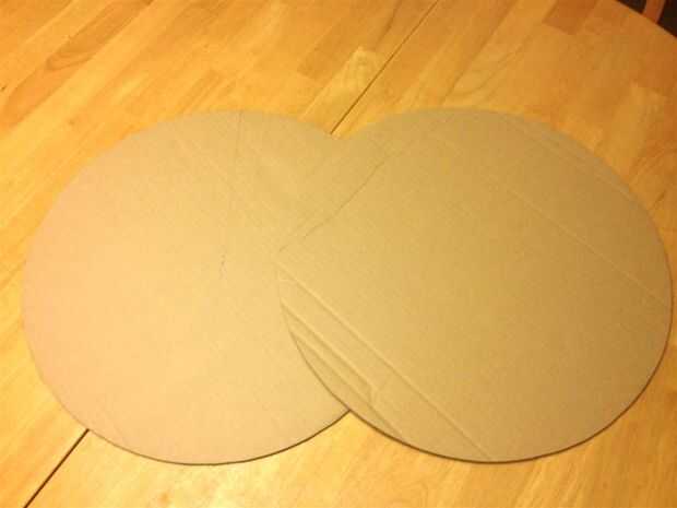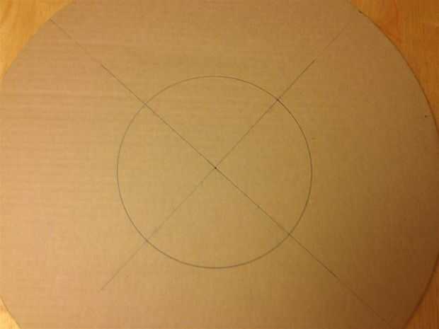 En una hoja de cartulina, dibujar líneas rectas desde esquinas opuestas haciendo una X en el medio. Únalos con cinta adhesiva las dos piezas de cartón entonces coloque una chincheta en el centro de la X y presiona bastante difícil perforar ambas hojas. Saque una tira de cinta adhesiva más tiempo del que necesita, en mi caso 11 pulgadas y poner la chincheta en el centro cerca de un extremo. La chincheta debe ir en el lado pegajoso y colocado en el centro de la cartulina con el color hacia abajo. Hacer un agujero en el otro lado de la cinta el radio del círculo, colocar un lápiz en el agujero y trace una línea alrededor. Cortar las dos hojas de cartulina en círculos de diámetro de 18 pulgadas. Usted puede hacer más grande o más pequeña para adaptarse a.