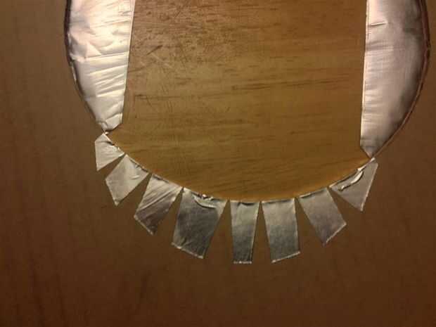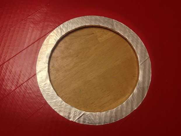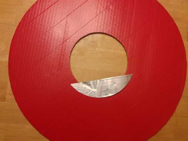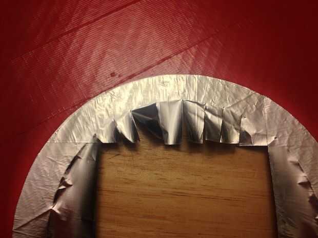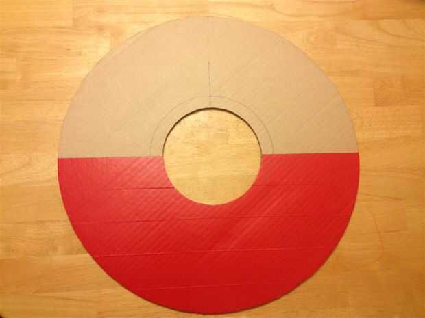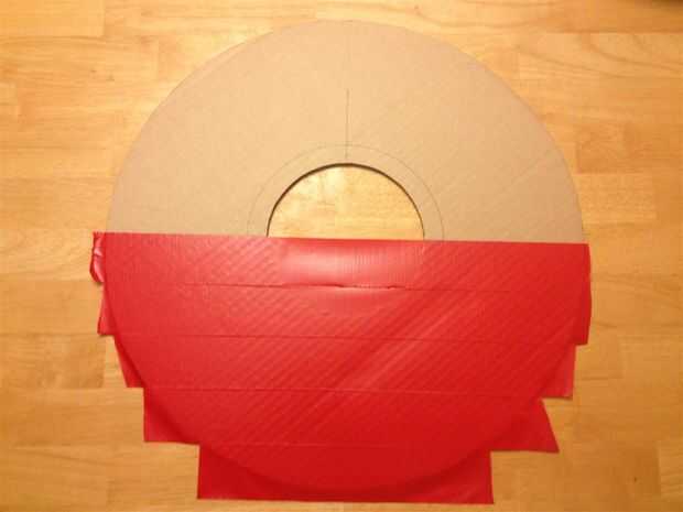 Tomar la pieza frontal de tu escudo y cubrir con cinta aislante roja. Mantenga la cinta recta y tratar de no se superponen demasiado como esta le dan el aspecto adicional de paneles de madera. Corte el exceso y agarrar las piezas de cinta de plata cortadas de antes. Coloque las tiras en la parte exterior del orificio. Corte la cinta plata y doblar el resto en el interior.