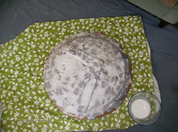 Ahora estamos listos para papel maché. En lugar de utilizar el tradicional papel maché estoy usando elmers pegamento y papel toalla las tiras blancas. He tenido harina papel maché ir mohoso en el pasado, es más bien usarlo, solo no quiero aprovechar la oportunidad. Me imagino que si voy a través del proceso de hacer un escudo espartano voy general quiere mantenerlo.
