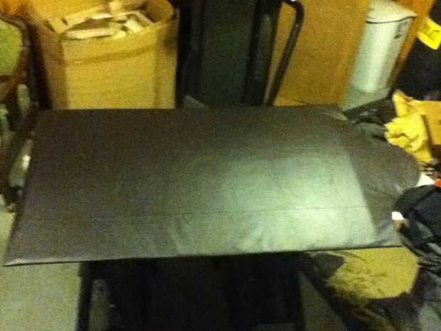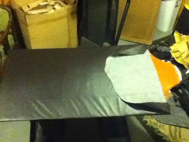 Colocación encima de mi escudo es de piel sintética. Según Homero, guerreros griegos tenían típicamente 7 capas de piel en estos escudos. Mina tiene 3 capas. La primera es de color roja, segundo es marrón oscuro y tercero es marrón claro. Para mantener estos, I utiliza una pistola de grapas, estiró el cuero y abrazaderas apretado al otro lado, grapas