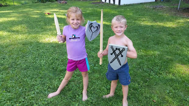 Mi hijo ha estado obsesionado con espadas/escudos últimamente. Este interés fue impulsado ayer por un viaje a la fiesta del renacimiento donde hubo 'reales' caballeros luchando contra él hacia fuera!