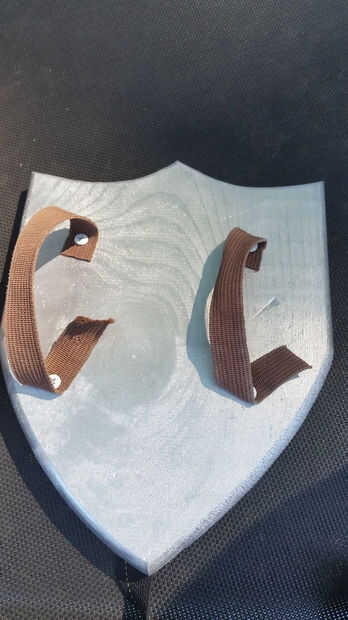 Hemos sacrificado un golpe encima de vieja mochila para algunas cintas que servirían como las manillas de escudo. Usted verá que simplemente utiliza unos pequeños tornillos para sujetar la cinta al escudo.