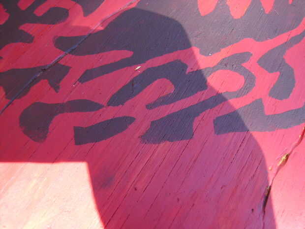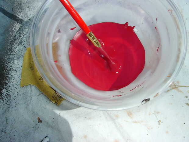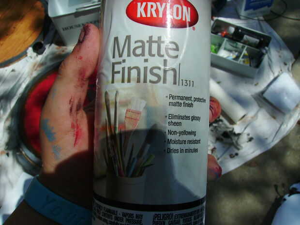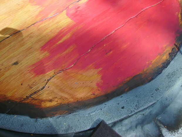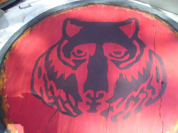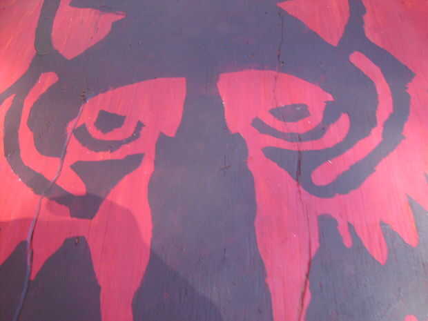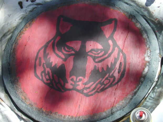 Partir de aquí voy a mostrar exclusivamente el diseño del lobo de la soledad por continuidad. Este trabajo de pintura consiste en un poco de pintura marrón, pintura roja y un color púrpura oscuro rojizo. Utiliza el marrón para acerca de una media pulgada en de los bordes. Luego, limpie el borde con el rojo y raya por el medio. (con grano) Cuidadosamente colocar la plantilla en el centro y pulsado con una variedad de tuercas pernos etc.. Esponja en el rojo morado intenso y levantar cuidadosamente el esténcil. Rellene sus puentes, corregir errores con el rojo (tenía unos pocos) y luego puede dejarlo seco y rociar encima con algunos mate acabado sellador.