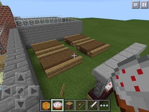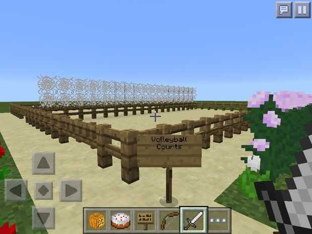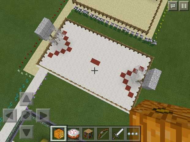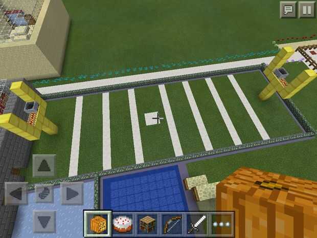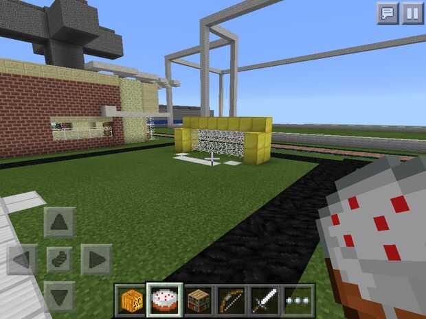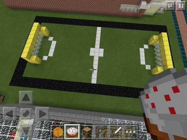 De estos exterior coloqué como nunca realmente se convierte en invierno en minecraft. Coloqué un fútbol campo que puede transformarse fácilmente en una cancha de fútbol campo o baloncesto. También coloqué una pista hacia abajo alrededor del campo. Moví la cafetería cerca de ella detrás de una de las salas con un camino que conduce a él por lo que es fácil de encontrar. Usé escaleras para asientos y bloques de madera para mesas. También he añadido una tabla con la torta para el almuerzo caliente.