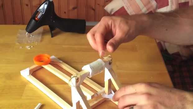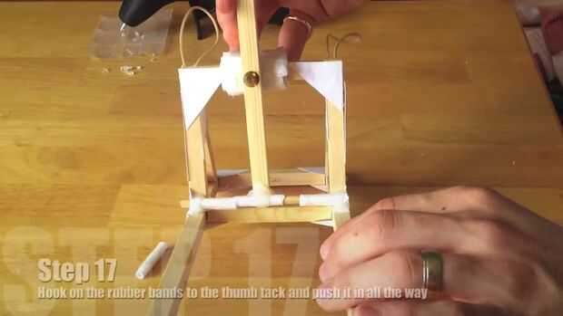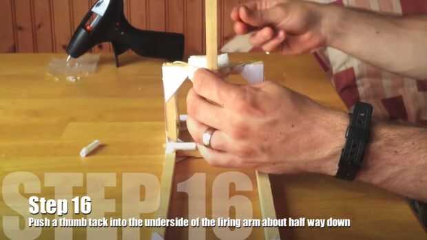 A continuación, levante el brazo de tiro y empuje thumb tack medio en el brazo de disparo medio camino a lo largo de la parte inferior. Levante cada banda de goma sobre el arco de soporte y gancho en la tachuela debajo del brazo de disparo.