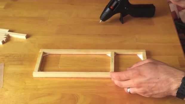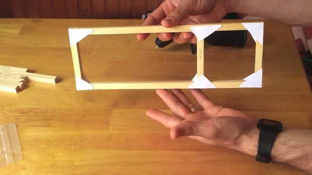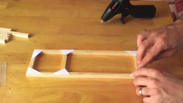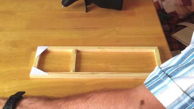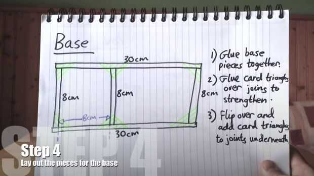 Coloque sus base pedazos hacia fuera como en la imagen siguiente. Entonces, utilizar un poco de pegamento caliente para unir una articulación juntos (asegurándose de que cada pieza es de 90 grados a la otra), asegurando pegando un triángulo de tarjeta en la parte superior. Repita para todas las restantes juntas, luego voltee la base y repita con triángulos de tarjeta en cada empalme para darle fuerza.