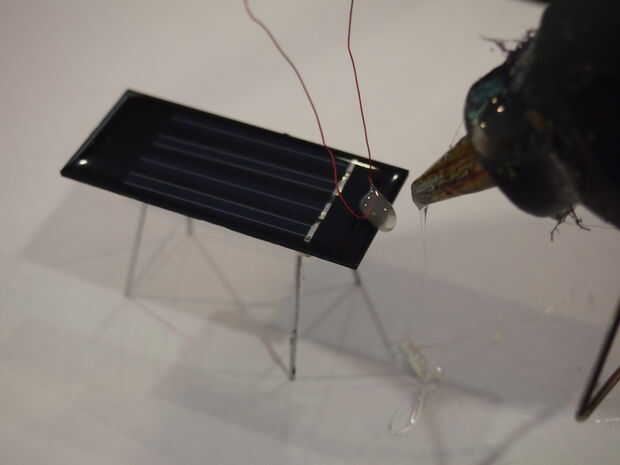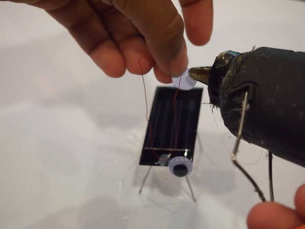 Si desea, puede utilizar una pistola de pegamento caliente para fijar un alambre y saltones los ojos a su célula solar. Para hacer la antena, uno de los cables y doblarla por la mitad. Utilice la pistola de pegamento caliente para fijar a la parte superior de la célula solar. Pega los ojos saltones al lado de la célula solar.