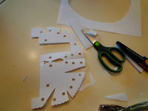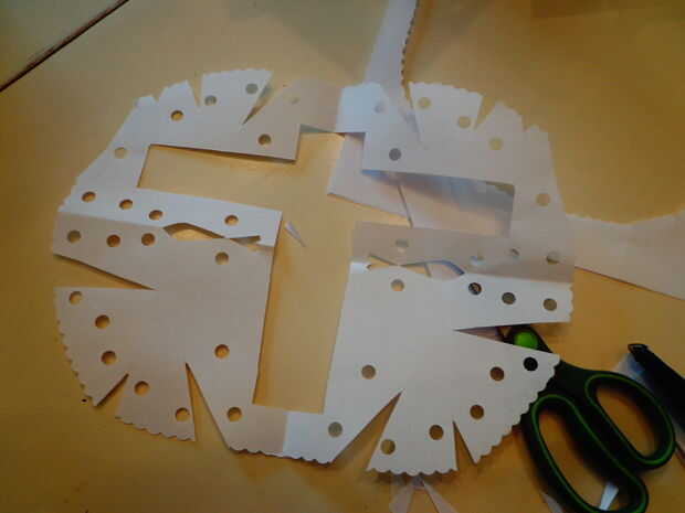 Con que cortar cuadrados verticales y horizontales. Doblar por la mitad. Luego perfore agujeros en que como usted por favor junto con el corte donde usted quiera. Doblez hacia fuera y agujeros donde hay espacios sin los agujeros.