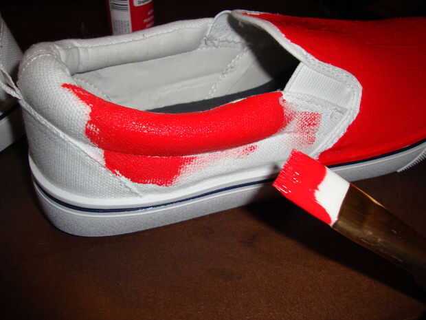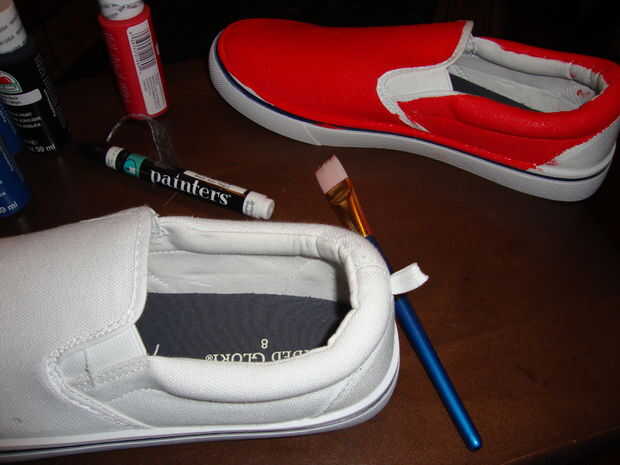 Decida lo que su necesidad de zapatos de color.  Colores de la escuela son rojo y azul así que decidí, por qué no hacer uno zapatos rojos y un azul.  Le di un par de capas para el rojo fue un bonito color rojo brillante y el azul era un color precioso.