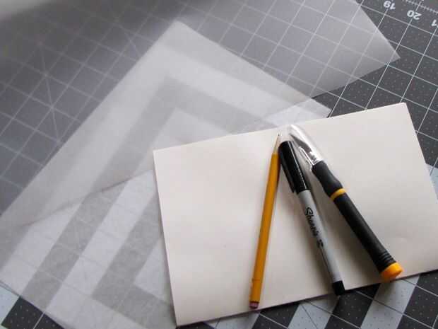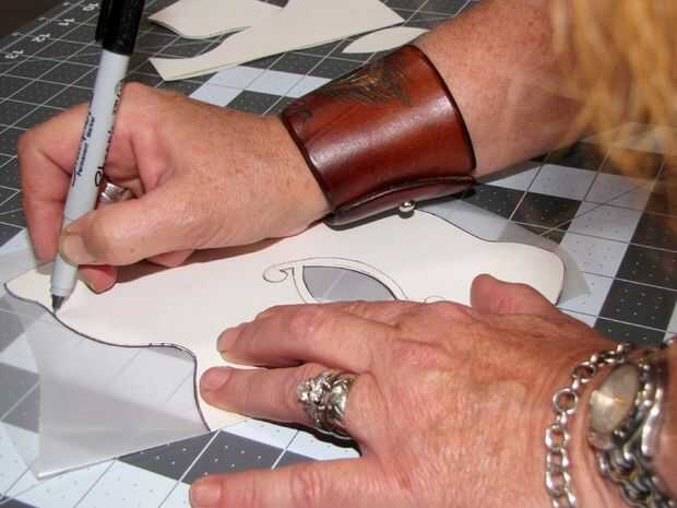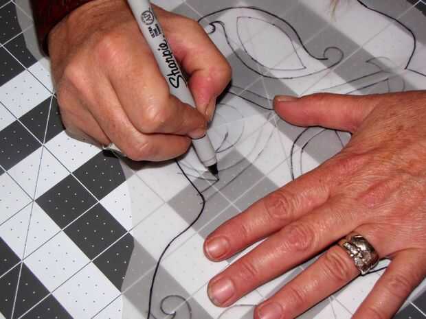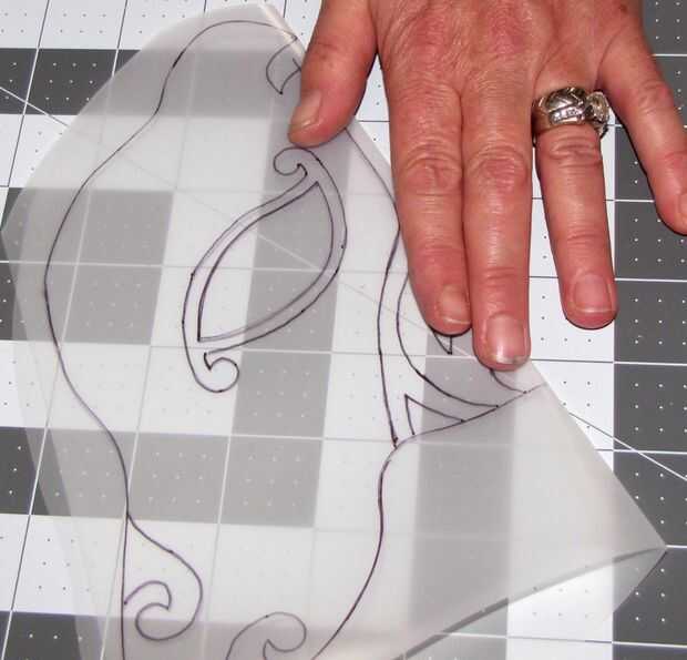 Deslice el patrón de doblado en la película de trazado doblado. Asegure con cinta si desea. Trace sobre los diseños en el patrón con su marcador sharpie. Quitar el patrón de papel y se voltea su película de calco o papel. Atentamente trace su patrón desde el otro lado. Abrir... Vea, usted hace su propio diseño de la máscara!