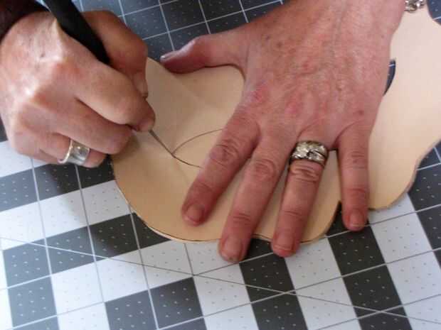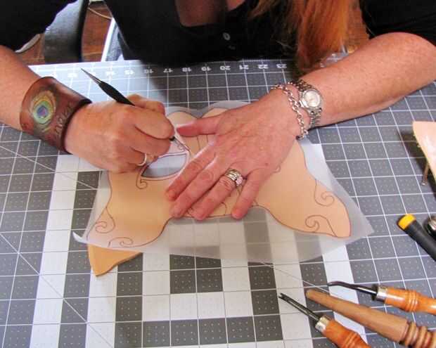 Transferir sus diseños al cuero. Humedezca ligeramente sólo la parte superior de la piel con la esponja. Ponga su película trazado sobre la piel, alinear cuidadosamente los ojos y los bordes. Utilizando un bolígrafo o lápiz, presione firmemente como traza sobre las líneas de diseño. Siempre comenzar con los ojos y utilizarlos para asegurarse de que mi película de la transferencia se mantiene alineado. No te preocupes si eres un poco tambaleante. Se puede tocar en el cuero con el rotulador o el lápiz.