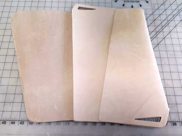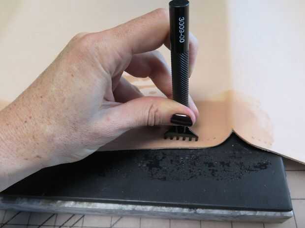 Una vez que se marcaron las líneas de costura en las piezas internas y externas de la computadora portátil, dobla la capa externa más en sí mismo, moje las líneas de costura con una esponja y utiliza un cincel de puntada diamante para perforar los agujeros de costura.