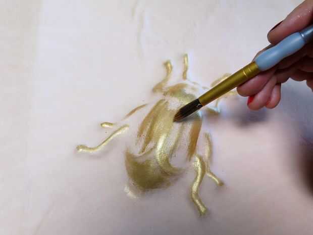 Primero detallados los bichos esculpidos utilizando una pintura de cuero de Cova Color oro y pincel. Luego utilicé una esponja extender varias capas de Waterstain Pro negro sobre toda la superficie de ambas piezas de cuero, dentro y por fuera.