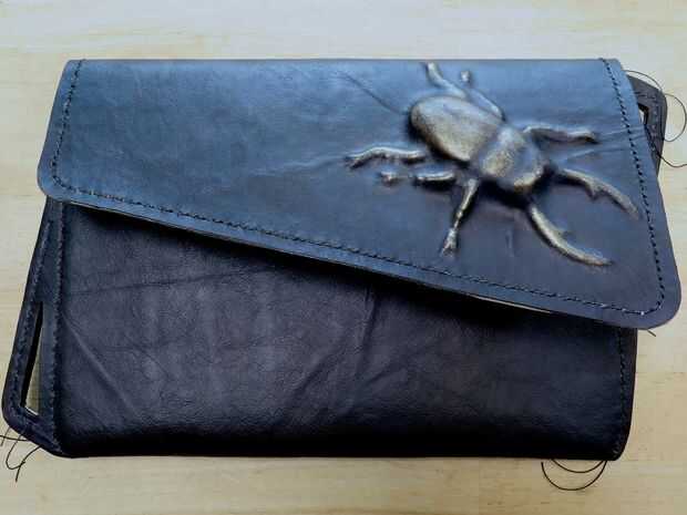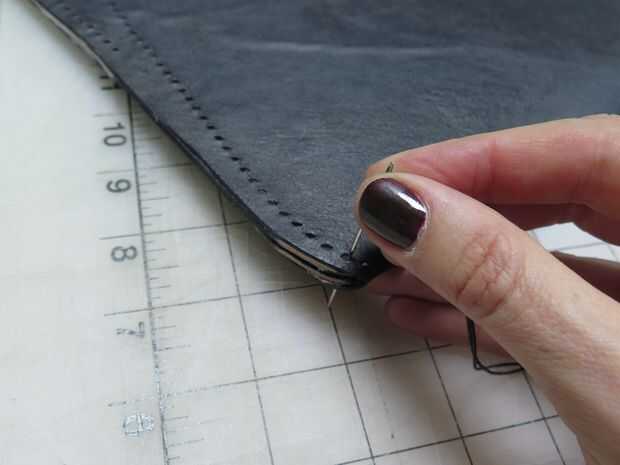 Para coser juntas las capas de mi caja del ordenador portátil utilicé cuero aguja e hilo encerado negro grueso para crear un punto de silla de montar.