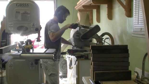 Empiezo con el asiento. La cantidad de material de 2 x 4 es lo que determinará el tamaño de mi banco ya es el factor limitante en mis materiales. Corté el 2x4s en 13.5" longitudes en la sierra para cortar ingletes. Asegúrese de que calmar sus piezas a la mesa para evitar que captura y patear hacia atrás. Es probable que si se utiliza material recuperado de 2 x 4 las juntas son muy combadas. Más sobre este tema en el siguiente paso.