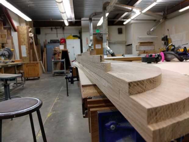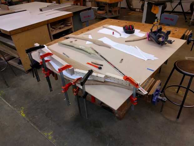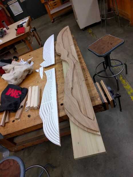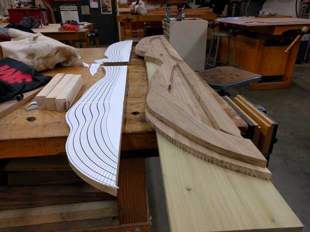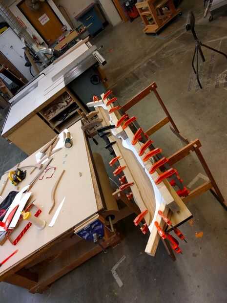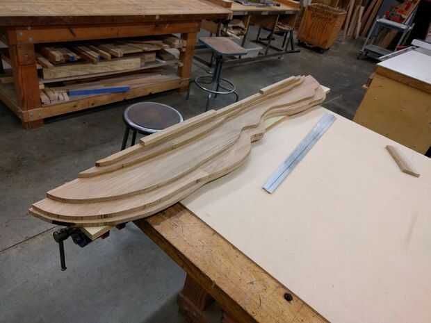 Este paso es bastante sencillo. A partir de la capa superior, corté las capas de la sierra, siguiendo los contornos de las formas impresas. Después de cada capa fue cortado, podría pegar a la capa anterior y mientras que fue secado, puedo trabajar en la capa siguiente. Esto significó que los estantes fueron construidos hacia abajo, lo que explica por qué sólo ven la parte inferior tallada en la mayoría la de las fotos. El plana superior es en la parte inferior. Asegúrese de que tener un montón de pinzas!