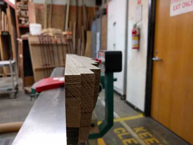 Después se terminó el pegamento-para arriba, solía una empalmadora incluso hacia la parte posterior de los estantes, asegurando que montaron al ras contra la pared con el estante tops ser perpendicular a la pared.