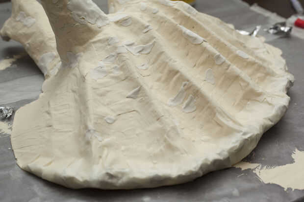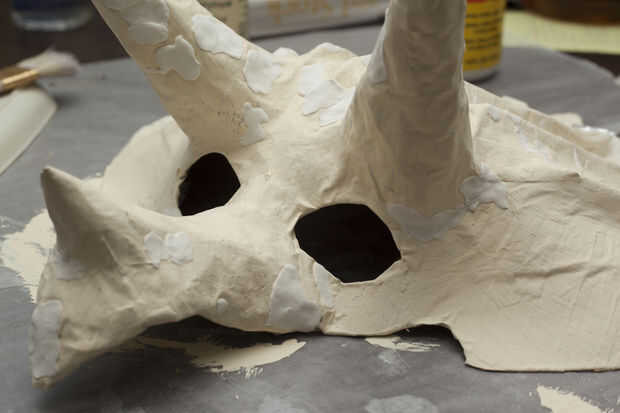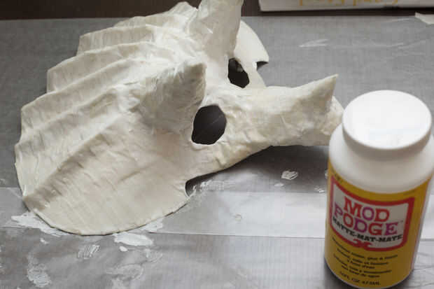 Opcional: Puede utilizar trocitos de arcilla al aire modelo magia para rellenar hoyos y guiones, lijar cuando sequen. De lo contrario, las piezas de cinta adhesiva tensada a través de los guiones. En cualquier caso, después se aplican múltiples capas de Mod Podge.