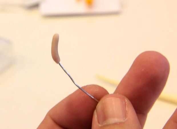 Orejas eran entonces pellizcadas de la cabeza. En el siguiente paso verás agujeros ante el gato de los bigotes, éstos fueron hechos con el fin de un clip de papel. Un clip de papel también se utiliza para hacer la cola arcilla vuelta y empujar un extremo en el cuerpo.