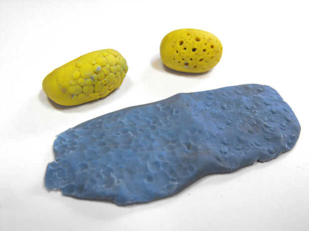 Mucho de la misma manera que sellos de tinta hacen impresiones en papel, sellos de arcilla se pueden hacer con facilidad textura en sculpey. En las imágenes que usted verá dos estampillas de textura amarilla que fueron hechos de barro y después cocido al horno, junto con ejemplos de la textura que hacen.