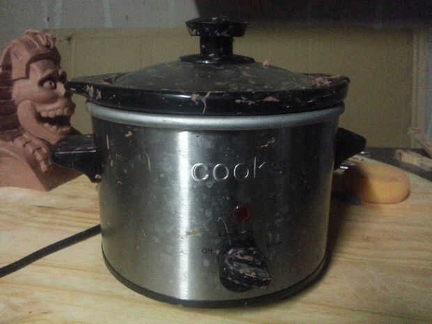 Usar una olla para calentar mi arcilla pero puede usar otras cosas como hornos tostadores o sartenes eléctricas. No recomiendo usar microondas para calentar chavant. Tener mucho cuidado con arcilla caliente. No puede parecer caliente, pero se puede y te quemará. Prod la arcilla con las herramientas para estar seguro.