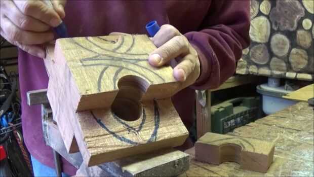 Hice el dibujo en un trozo de madera de meranti y comenzó con dos orificios con una mechas forstner de 40mm de perforación.