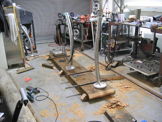 Lamentablemente, aunque parezca que todo se estaba moviendo a lo largo sin problemas, todavía no tenía ninguna manera para apoyar todo esto movimiento de masa. La tentación era cada uno de los soportes de tres pasamano perno directamente al piso. Esto habría significado sólo exhibir la pieza en lugares con pisos de concreto y mucho agonizante alineación al comienzo de cada instalación. Con los años he aprendido que una escultura de este tamaño tenía mejor ser portable si usted nunca espera encontrar un hogar para él. Lo que se necesitaba una base de algún tipo que me permita fijar permanentemente los tres puestos y el motor. Entonces se pudieran quitar todas las otras partes para el transporte.