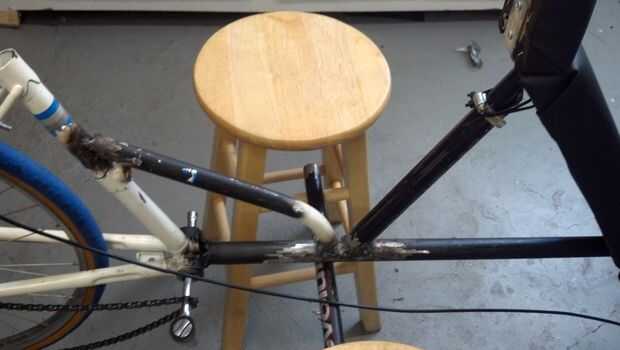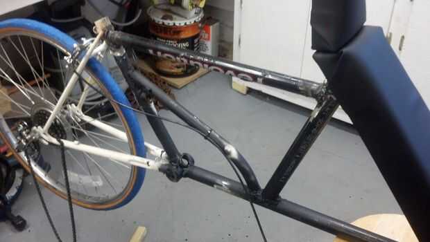 Para construir el marco, corte las piezas con un corte abrasivo vieron y moler los extremos para encajan las tuberías, esto se llama pescado-articular las tuberías. También asegúrese de moler toda la pintura de los extremos de los tubos para asegurarse de que la soldadura es fuerte. Después de eso, conectar los tubos junto con el soldador. He añadido una columna de respaldo asiento detrás de la espalda del asiento sustenta el pasajero al empujar los pedales. Entonces, conecté el tubo de la horquilla de la bicicleta en la parte posterior del asiento a la columna de poste de asiento con el tubo superior de una bicicleta de donantes.