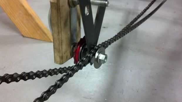 Para crear la línea de transmisión, primero me había aserrado apagado el soporte inferior de una de las motos de donantes y había soldada al tubo central del bastidor después de colocarlo donde estaba confortable a pedal. Yo no toque la palanca de cambios primaria que todavía estaba en tubo del asiento de la bicicleta de donantes porque quería reutilizarla. Entonces, vinculados a cadenas de las motos de tres donantes usando la herramienta de cadena de bici. Después de que la cadena se juntan, empecé a probar diferentes diseños de rueda locos. Comencé con una serie de pequeños tubos metálicos de la cadena se deslice a través y esto funcionó decentemente, pero la cadena rasgar lentamente una ranura en el metal y que finalmente se rompió. También creó un ruido no deseado. El siguiente diseño incluyó una de las poleas de cadena de una bicicleta de donante a una placa de acero plana desde el tubo en un perno "U". Esto funcionó muy rueda comparada con el anterior, pero la cadena caería constantemente fuera de la rueda de la polea. Necesita una pista en ambos lados de los dientes de la polea así la cadena no hay donde ir. También teníamos que hacer algo con la cadena de retorna que no tiene ninguna tensión.