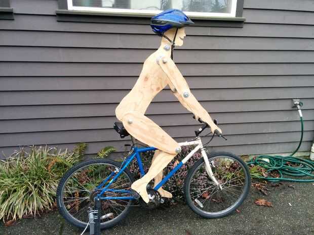 Me pidieron que haga una escultura cinética para un evento de reconocimiento de la bicicleta. El plan era hacer un recorte de madera de una figura humana, que sería montado en una bicicleta con los pies en los pedales. De esta manera cuando se girar los pedales, la figura se mueve como si fue pedaleando.