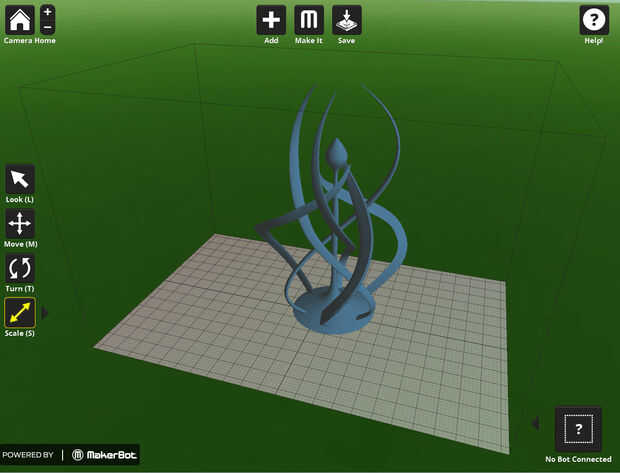 Esta es una imagen de la aplicación de MakerWare de MakerBot con la escultura importada como un archivo OBJ y listo para construir.