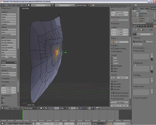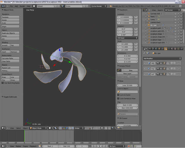 Para el diseño de la lámina, una vez más usé curvas Bézier que se unieron para formar la parte exterior de la hoja y otra en el interior para proporcionar un identificador para dar forma a la parte de la Copa de la hoja. Estas curvas cerradas fueron conectadas y luego llena como un objeto plano. La segunda imagen muestra el proceso de sacar el centro para formar una taza para atrapar el viento.