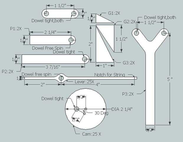 .. .if que usted tiene la máquina CNC. Si no en algo de buena música y frente a la Sierra de banda. Se adjunta, es un PDF de las partes principales y las cantidades necesarias. Puede medir en su material o simplemente imprimir el PDF en una escala de 1 a 1, luego utilícela como una plantilla. También es el archivo de Sketchup. Bueno... empezar a cortar. Cuando hago mío creo que podría intentar encontrar que un serrucho que es del tamaño adecuado para crear las levas. Esto le dará un bonito círculo consistente con un agujero de centro definido a medida de.
