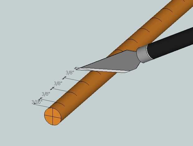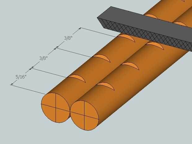 Ahora seguro 2 de 9 5/8 en tacos junto con los extremos al ras, utilice cinta o alguna cosa otra cosa temporal. A partir 5/16 in de sea hacer final una pequeña muesca en ambos ejes mediante un archivo; seguir haciendo muescas cada 3/8 pulg hasta que tenga 25 muescas. Verifique que el hilo que vas a utilizar se deslice libremente en las ranuras.
