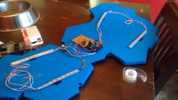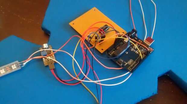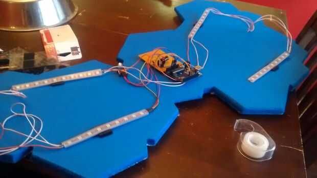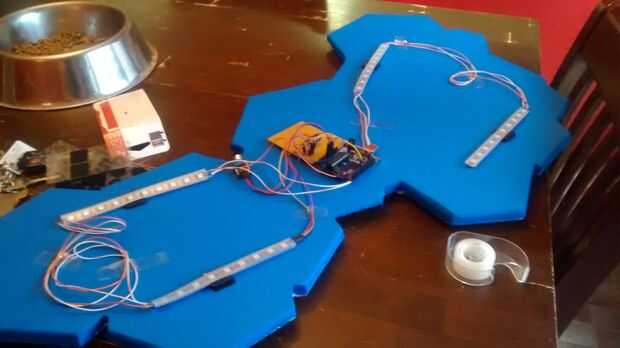 Posicioné el protoboard, mini sensor de los sonidos, Arduino Uno, y Neopixel secciones en la parte posterior de la escultura y luego tomó Velcro sujeta hacia abajo. Entonces arregla el cable múltiple trenzado cuidadosamente en la parte de atrás y había fijado con cinta adhesiva transparente.