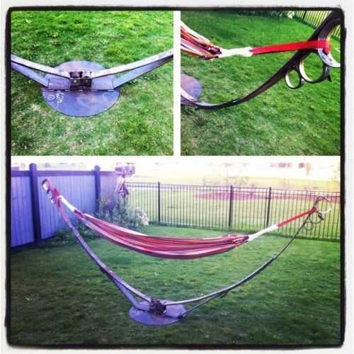Para esto usé otra vez chatarra de acero, los círculos de los extremos son de cojinetes de rueda de remolque, desmontados, los brazos son grandes resortes de un viejo acoplado semi, soldado con autógena junto para mí y mi hamaca.