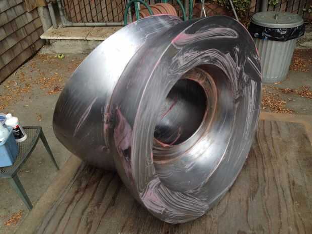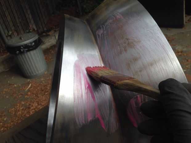 Puesto que la escultura fue oxide ante mis ojos, decidí utilizar algunos jalea Naval para quitar el moho. Jalea naval se conoce como un "disolvente de óxido", pero es un poco engañosa. El ingrediente activo de la jalea es ácido fosfórico y en lugar de disolver el óxido (óxido de hierro), convierte en fosfato de hierro, que es mucho más estable. Aplicar con un pincel y frotando ligeramente con un paño o scotch brite cojín. Déjelo secar por unos minutos (más tiempo si tu tratando de eliminar el óxido pesado) y enjuague bien. Puede repetir este paso hasta que el moho haya desaparecido. Si usted no mover a su pátina rápidamente, la pieza conseguirá oxidada otra vez en poco tiempo como resultado de toda el agua que ha sido aplicado para el acero desnudo.