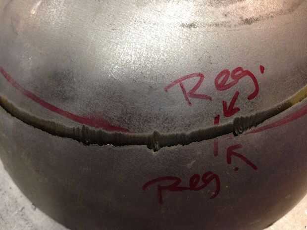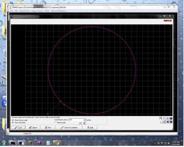 La escultura consiste en secciones de 6 hemisferios en 3 diferentes tamaños: 16", 10" y 8". Patrones circulares debían cortarse en algunos de los hemisferios para permitir una cúpula correspondiente al "nido" en el lugar en posiciones predeterminadas. Hice algunas pruebas para determinar si el corte del eje de multi era necesario y set cerca cortando algunos pequeños hemisferios en 90 grados a la cama de la máquina. Como el chorro de corte alejado del centro de la bóveda, la calidad del corte se deterioró rápidamente. Puedes ver lo que parece una antorcha mal corte en la primera foto. Así que, corte del eje de multi era necesario después de todo. Había inicialmente alguna discusión con el personal de la tienda sobre el uso de Intellicam, una aplicación de ordenador asistido por mecanizado avanzada que puede generar trayectorias de herramienta 2D y 3D, pero decidimos que corte con el A jet haría el truco. A Jet (OMAX realmente se refiere a él como "La inclinación a Jet"), permite que el cabezal de inclinación y giro para crear cortes biselados que es lo que necesitaba. Generar las trayectorias de herramienta era fácil puesto que las formas a cortar eran simples círculos. La parte difícil era determinar el ángulo de los cortes y crear accesorios para las piezas que le sólidamente mantenerlos al nivel adecuado. La altura Z del viaje es menos de 5" con el cortador de chorro de agua muelle 9 y la mayoría de las piezas que tenido que cortar era más alta que el.