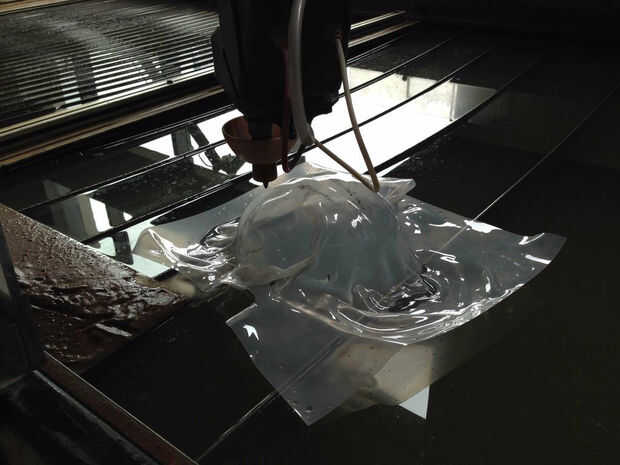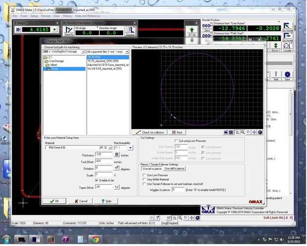 Después los caminos se generaron, A Jet necesita para estar habilitada y un desplazamiento de forma cónica entró en el campo apropiado. Tenga en cuenta que un desplazamiento negativo de forma cónica bisela el corte para que sea más ancho en la parte superior de sus medios. La literatura OMAX declaró lo contrario así que siempre hacer pruebas o al menos seco para asegurarse de que usted está biselado de la manera correcta. Estaba bastante seguro de que iba a romper la punta de corte de la cortadora de chorro de agua al chocar con una cúpula de acero. Por lo tanto, uno de los miembros del personal de tienda impresionante (Martin Horn) sugirió hacer una cúpula de plástico de peso ligero que se simplemente se deslizan a lo largo de los listones de la máquina si la cabeza golpea. Puedes ver el plástico hermoso cosita en la segunda foto que fue hecha por el plástico con una pistola de calor de la calefacción y poner sobre un hemisferio. Si querías ser super cool, podría vacío forma parte pero no he aprendido a utilizar el anterior vacío. En cualquier caso, la cúpula de plástico como cosa menos deje me la trayectoria de la herramienta sin preocuparse demasiado que rompo la máquina.