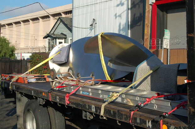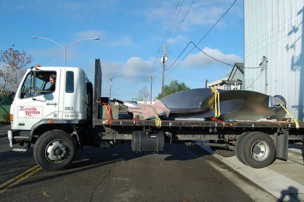 Esta pieza acabó mide casi 18 pies de altura y pesaba alrededor de 1.700 libras para llegar al sitio no era trivial. Me alquilan un camión de cama juego de 24 pies y quitar las canastas para cargar la pieza con el puente grua en mi estudio. Sujeta firmemente la pieza y trajo todas las herramientas necesarias para la instalación. Si no eres consciente, cualquier jackass (suya realmente) con una clase C licencia de conducir puede alquilar un camión grande como el ilustrado aquí, carga con todo tipo de cosas locas y rodar por la carretera. Mi consejo es mantenerse alejados de dichos vehículos siempre que sea posible!
