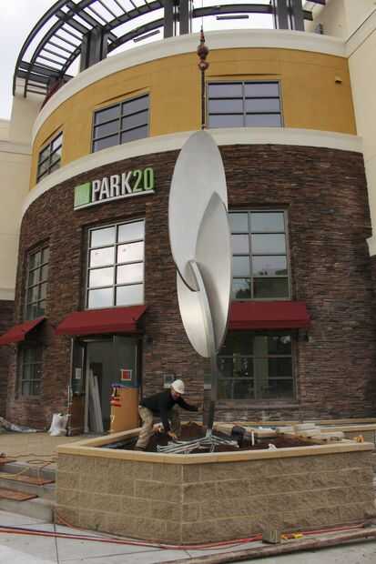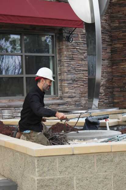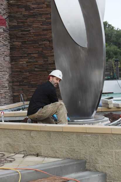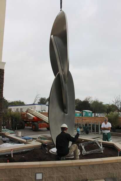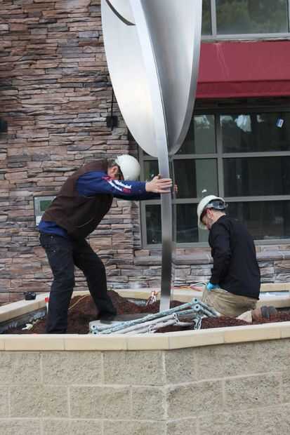 La base de concreto reforzado con acero fue vertido un mes antes de instalar la escultura. Normalmente, echarían pernos de anclaje en el hormigón usando un patrón de la placa base de la escultura. En este caso, me decidí a localizar la pieza en sitio por lo que pude afinar la orientación. Hemos creado la escultura en el pie y dejar una cantidad significativa de peso en la grúa, registrado la pieza hasta la orientación deseada. Por cierto, es mi amigo y colega, Wayne Shaffer, ayudando en la segunda foto. No tengo ni idea que el caucho necker está en la foto #3. En la perforación.