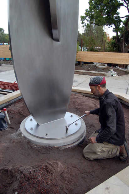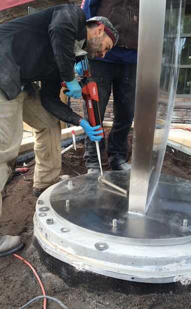 Los planes requieren un Hilti Epoxy con poco tiempo de trabajo. Por lo tanto, perforado y limpiar todos los 8 agujeros, presentados los pernos, arandelas y tuercas y preparado para inyectar el goo. Esta parte del proceso es crucial: es importante distribuir el mortero en la parte inferior del agujero y levante lentamente la pistola como el agujero se llena para permitir que escape el aire. Inserte los pernos inmediatamente después el epoxi se ha inyectado dándole un 1/4 vuelta cuando se empuja hasta el fondo del agujero. Atornillar sin apretar las tuercas, limpia y tenía una cerveza mientras esperamos 1 hora para el epoxy curar. Entonces para el momento de la verdad: cada una de las tuercas a 100 lbs-pie de par de apriete. Comenzó a 50 ft-lbs, apretó las tuercas para distribuir la carga en la placa base de la oposición y poco a poco aumenta el par hasta llegar a 100. Trabajó como un encanto.