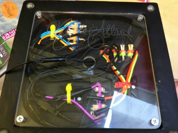 A continuación cortar una placa de acrílico transparente en un láser de corte para caber el bolsillo en la base del cubo, con agujeros para los tornillos de la esquina, un agujero en el centro para el cable de alimentación y con mi firma grabada en ella. He incluido todos los cables en el bolsillo en la base del cubo y atornilla la placa de acrílico para mantener en su lugar.