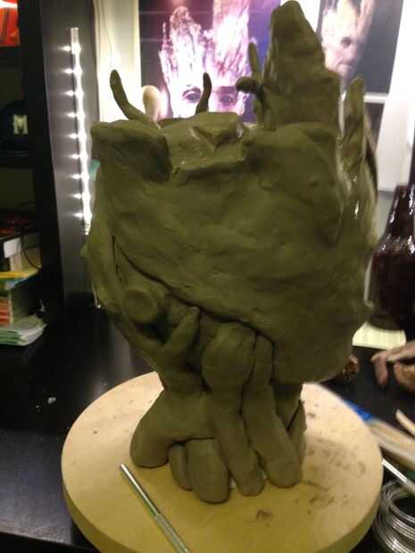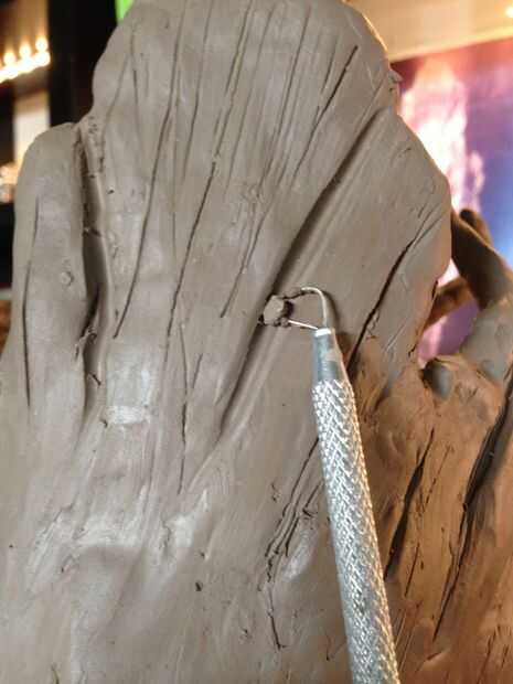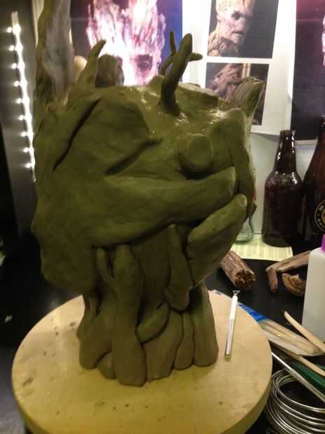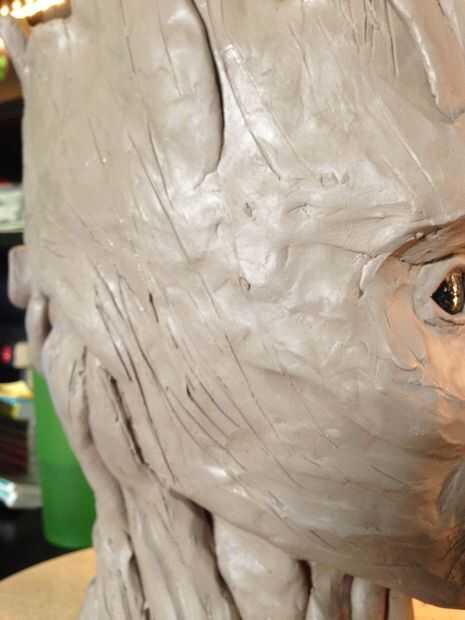 - Más detalles: esto es cuando la escultura de Groot realmente comienza a buscar legítimamente como la madera. Usé mi madera de referencia tipo de como sellos alrededor de la escultura. Tomar la madera donde el grano y los detalles son realmente visibles y suavemente la estampilla de la arcilla con, en todas partes. Si hay partes de la escultura que se forman demasiado extraña para que la madera llegar a, también encontró que rascarse mucho la superficie y luego alisar ligeramente hacia abajo hacen la arcilla tienen el mismo aspecto. Puede también añadir ángulos ásperos donde la madera es demasiado redonda y luego rayar hacerla lucir como la madera ha astillado o algo. Este es el paso donde se pueden hacer los lugares más vacíos entre ramas de aspecto natural y leñosos.