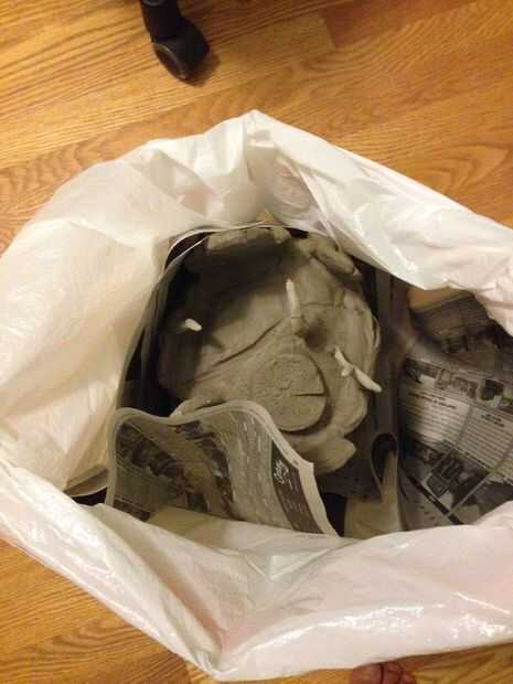 ARCILLA con base de agua: Generalmente, cuanto más lento se secar la arcilla mejor; Ralentizar el proceso de ayuda a la escultura seco más uniformemente, que consecuentemente evita grietas. Simplemente poner la escultura en una bolsa de basura y atado en la parte superior con una banda elástica para retardar la evaporación. Para evitar que la bolsa mojada estropear mis datos, pongo algunos periódico entre la escultura y la bolsa. Cambié el diario periódico y Airee el busto seco mientras que cambié el papel. Tambien he leido que libremente cubriendo la escultura en los alimentos claro envoltura funciona también, pero nunca probé.