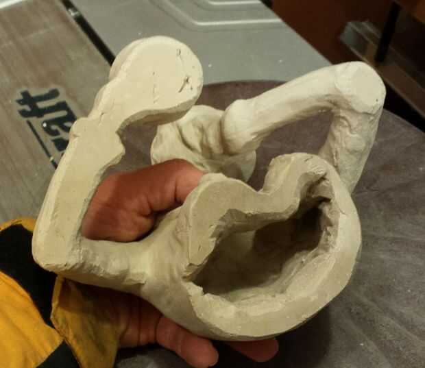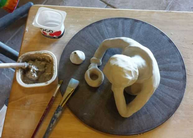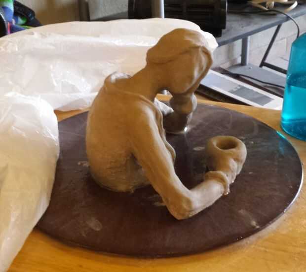 Después de las reparaciones rocíe la figura hacia abajo con agua 2 o 3 veces y él debajo de un plástico del bolso con un recipiente pequeño de agua caliente. Más tarde ese día sustituí el agua con agua caliente. La humedad que penetra en la arcilla y se seco todo el asunto un poco más cuidadosamente esta vez.