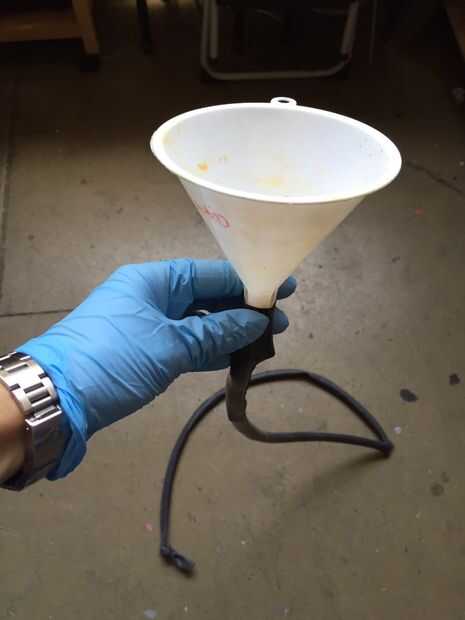 ATA un extremo de la llanta de bicicleta que coloque ese fin en el suelo o mejor en una caja de cartón. Este proceso es un poco desordenada y si no quieres epoxy sobre cosas al azar debe seguir trabajando en la caja de cartón. Une el embudo en el otro extremo de la llanta de la bicicleta y la sostuvo para arriba. Entonces pobre muy suavemente y poco a poco el epoxy mezclado en la rueda de intervalos para asegurarse de que el epoxi se desliza dentro del neumático hasta el nudo. No sobre relleno - que significa mantener al menos 2-3 pulgadas de bicicleta del neumático en la parte superior que no tiene cualquier epoxi en él. Esto es para el porpos de atar el otro extremo de la llanta de bicicleta. Luego atar el otro extremo de la llanta de bicicleta asegurarse de que es un nudo apretado. Esto conseguirá desordenado tendrá algunos epoxy en las manos y algunas gotas en la caja está trabajando en. Por esta razón los guantes es obligatorio.